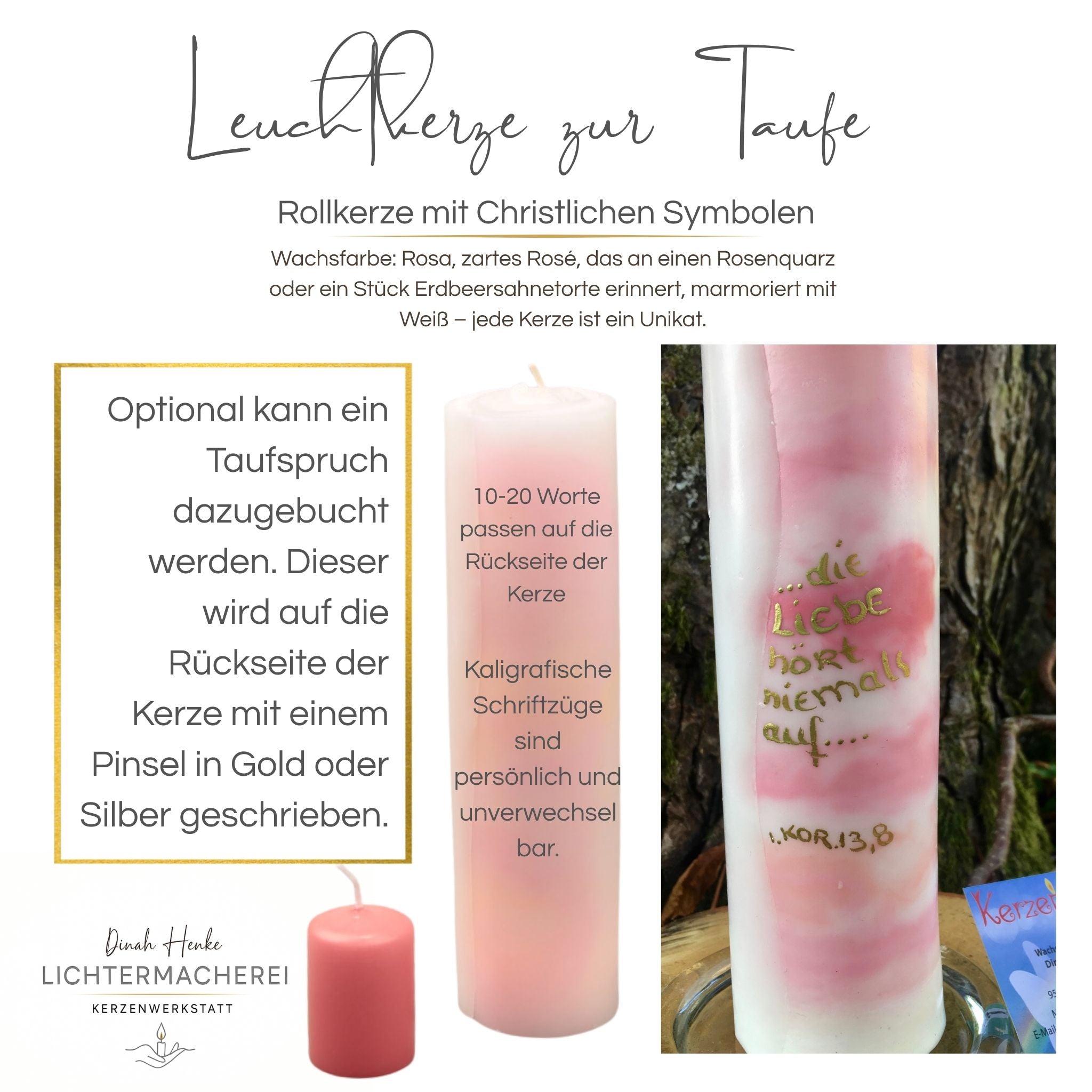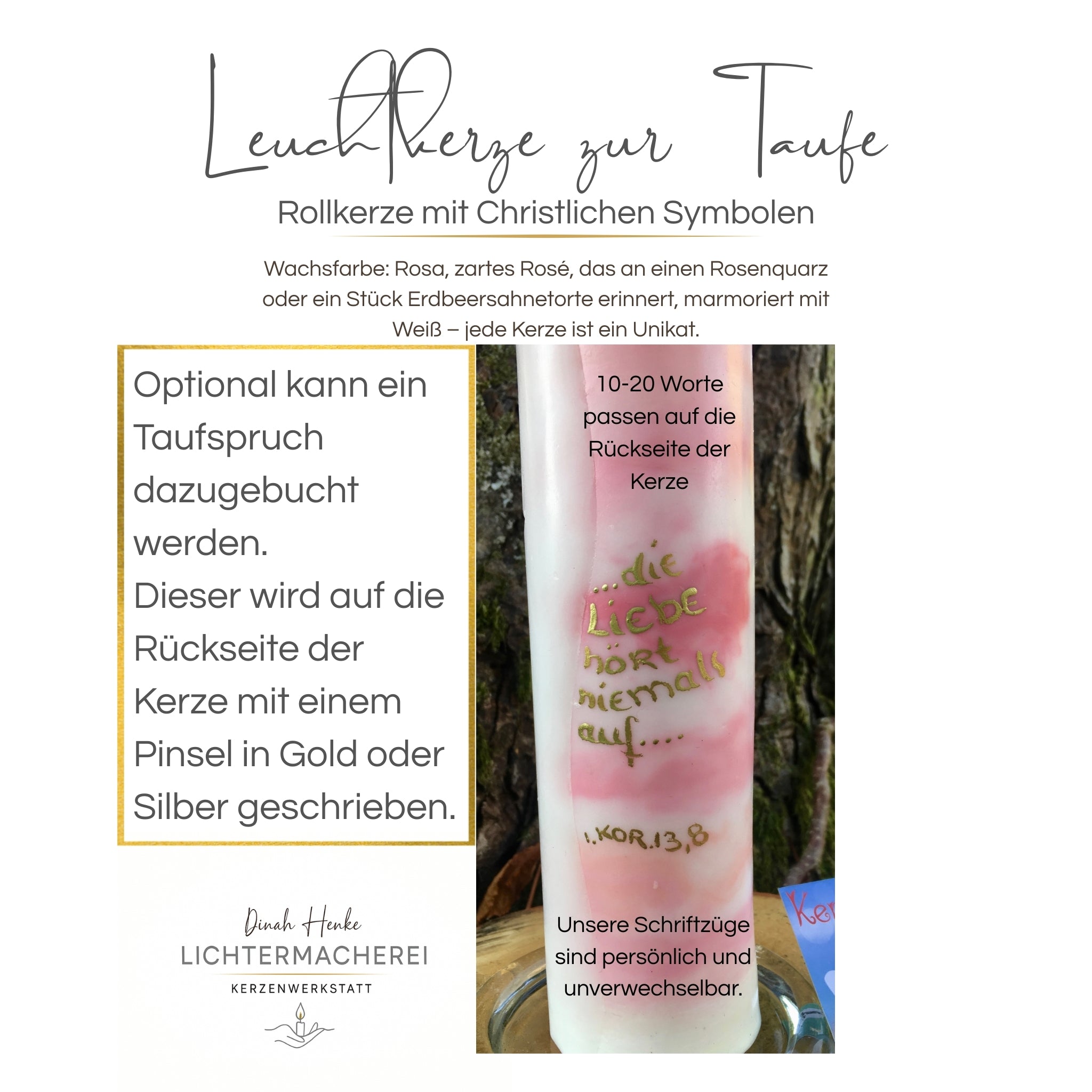 Unsere einzigartige gerollte Leuchtkerze zur Taufe, Konfirmation oder Kommunion ist nicht nur eine Kerze, sondern ein bedeutungsvolles Geschenk, das mit viel Liebe zum Detail handgefertigt wurde.