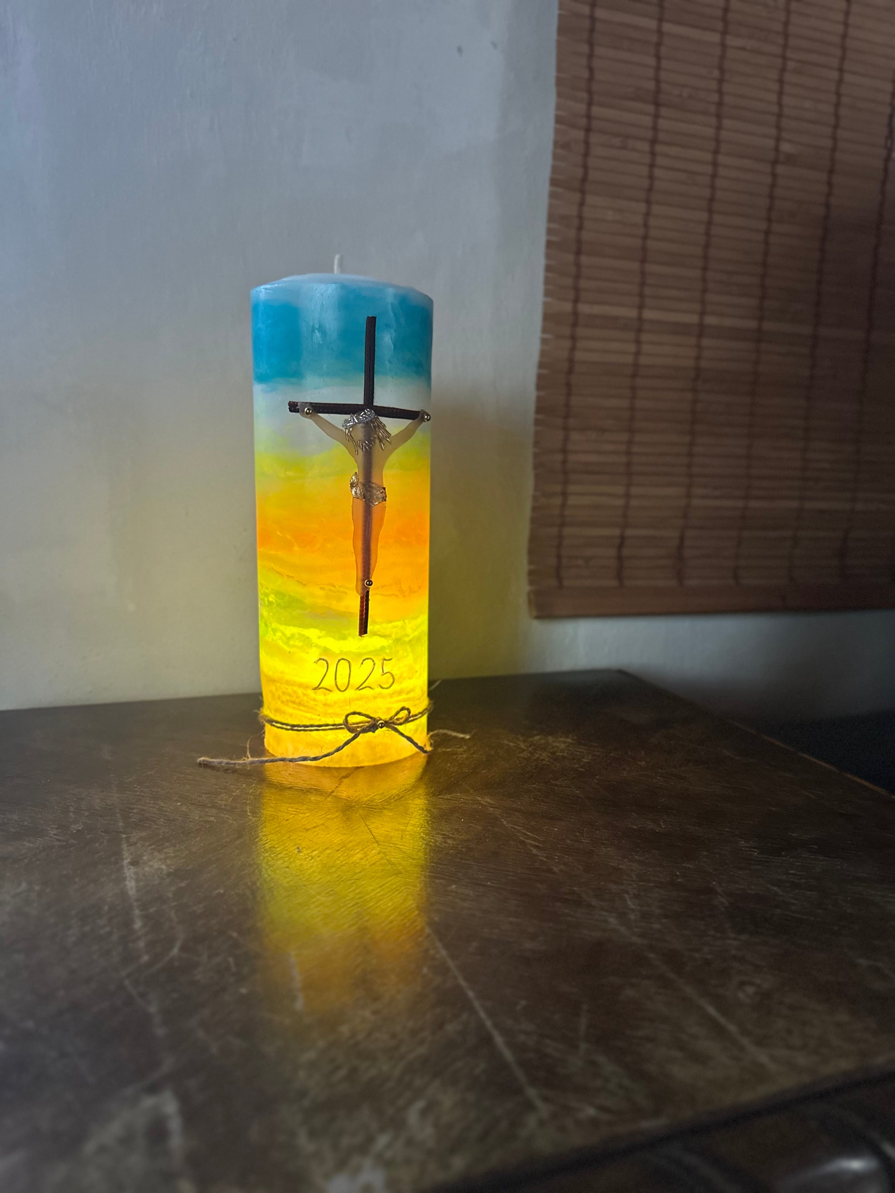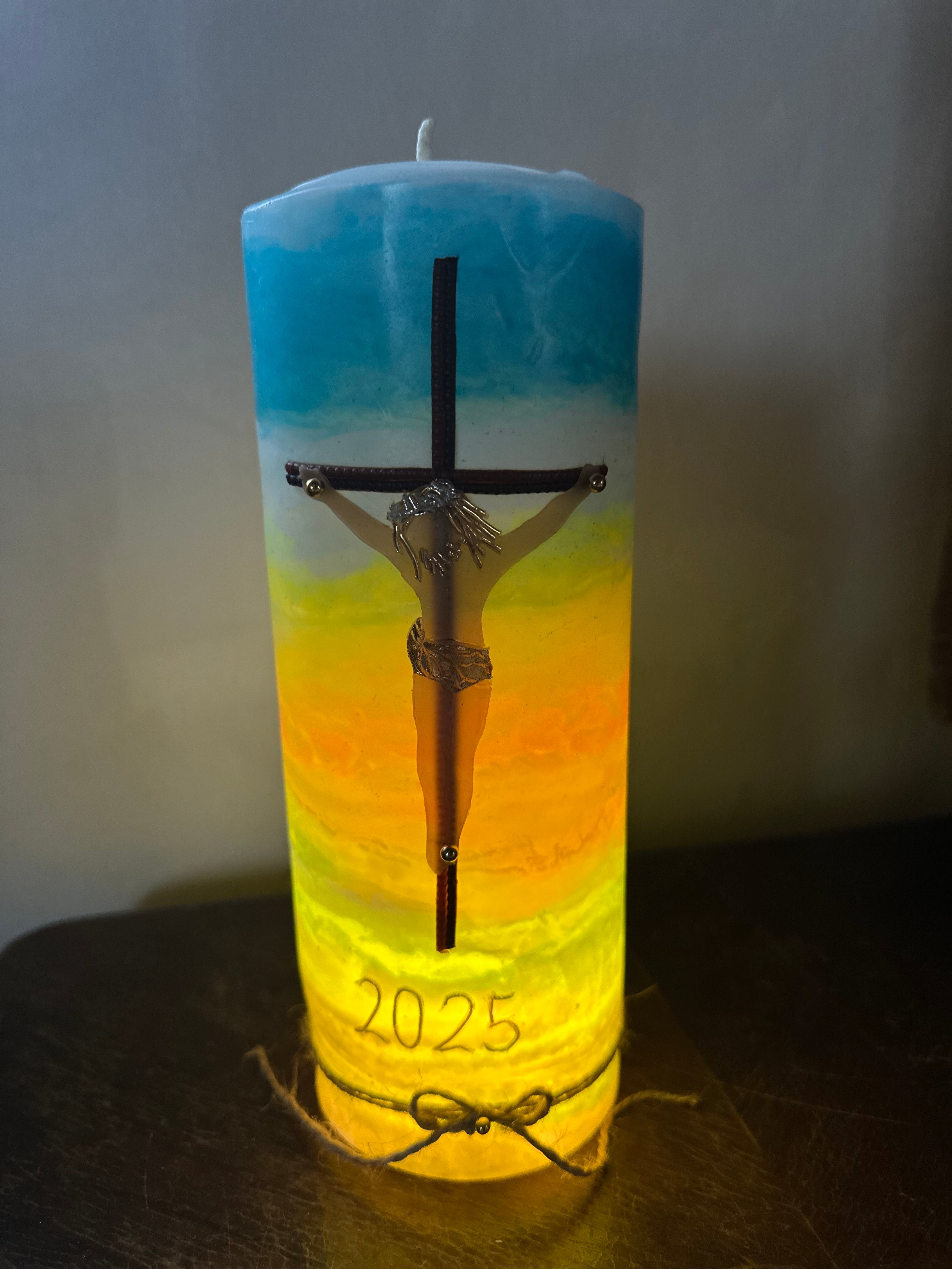 Das zentrale Motiv – Jesus am Kreuz – steht für die Botschaft von Hoffnung, Hingabe und Auferstehung und macht diese Kerze zu einem besonderen Begleiter für Karfreitag, Osternacht und das Osterfest.