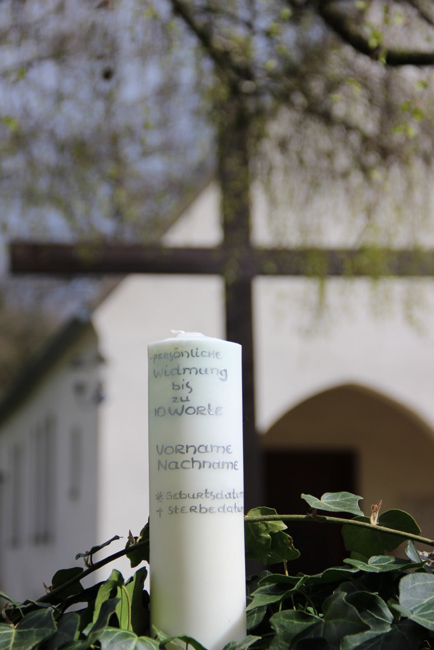 Diese Erinnerungskerze spendet Licht und Trost – auf dem Traueraltar, in der Kirche oder zu Hause – und bewahrt die Erinnerung in stiller Schönheit.