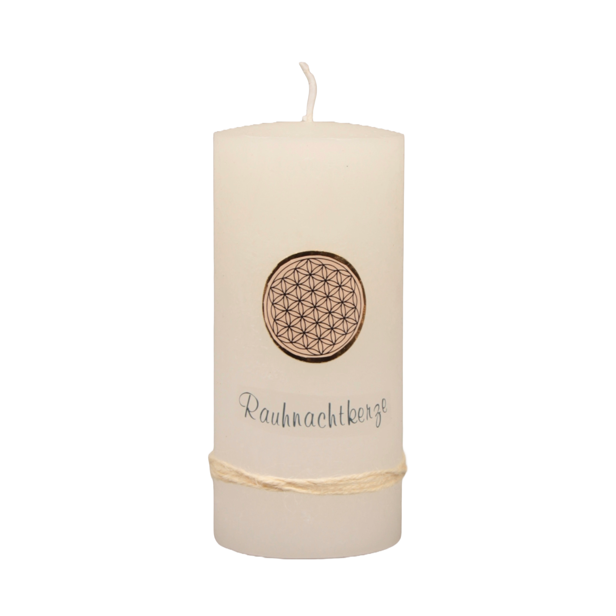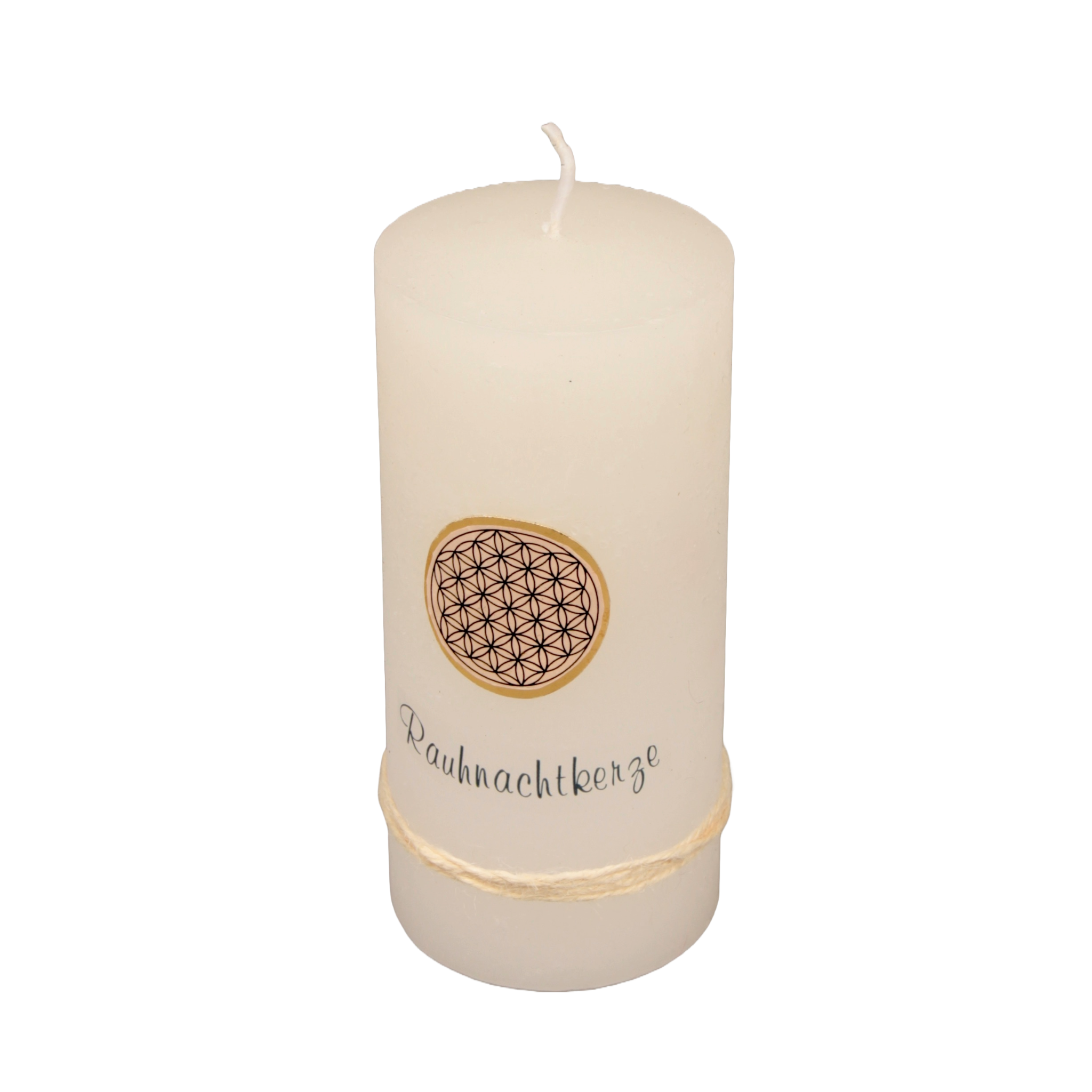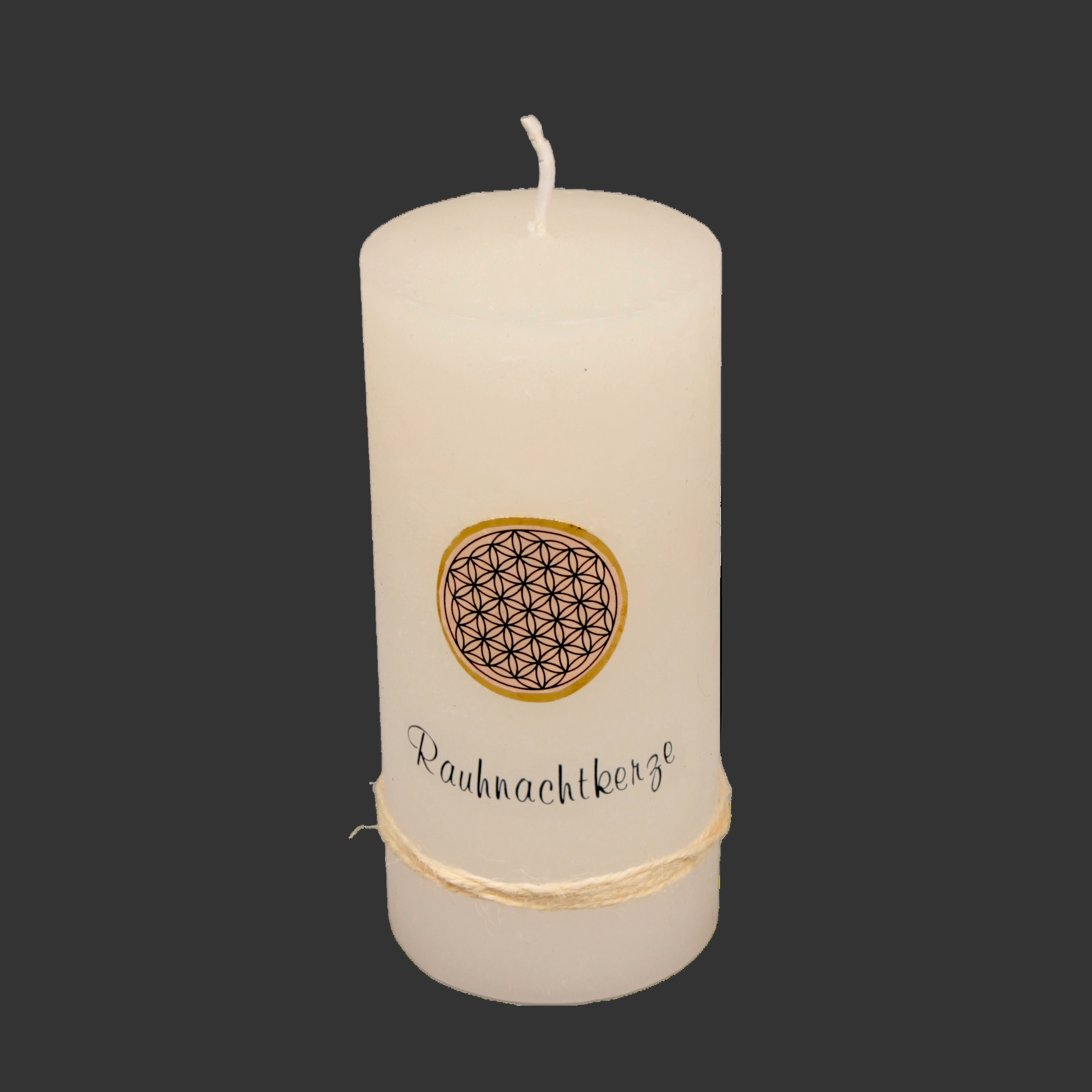 Diese handgefertigte Rauhnachtkerze in edlem Weiß mit rustikaler Oberfläche begleitet dich durch die geheimnisvolle Zeit zwischen den Jahren – eine Phase des Loslassens, der Ruhe und des Neubeginns.