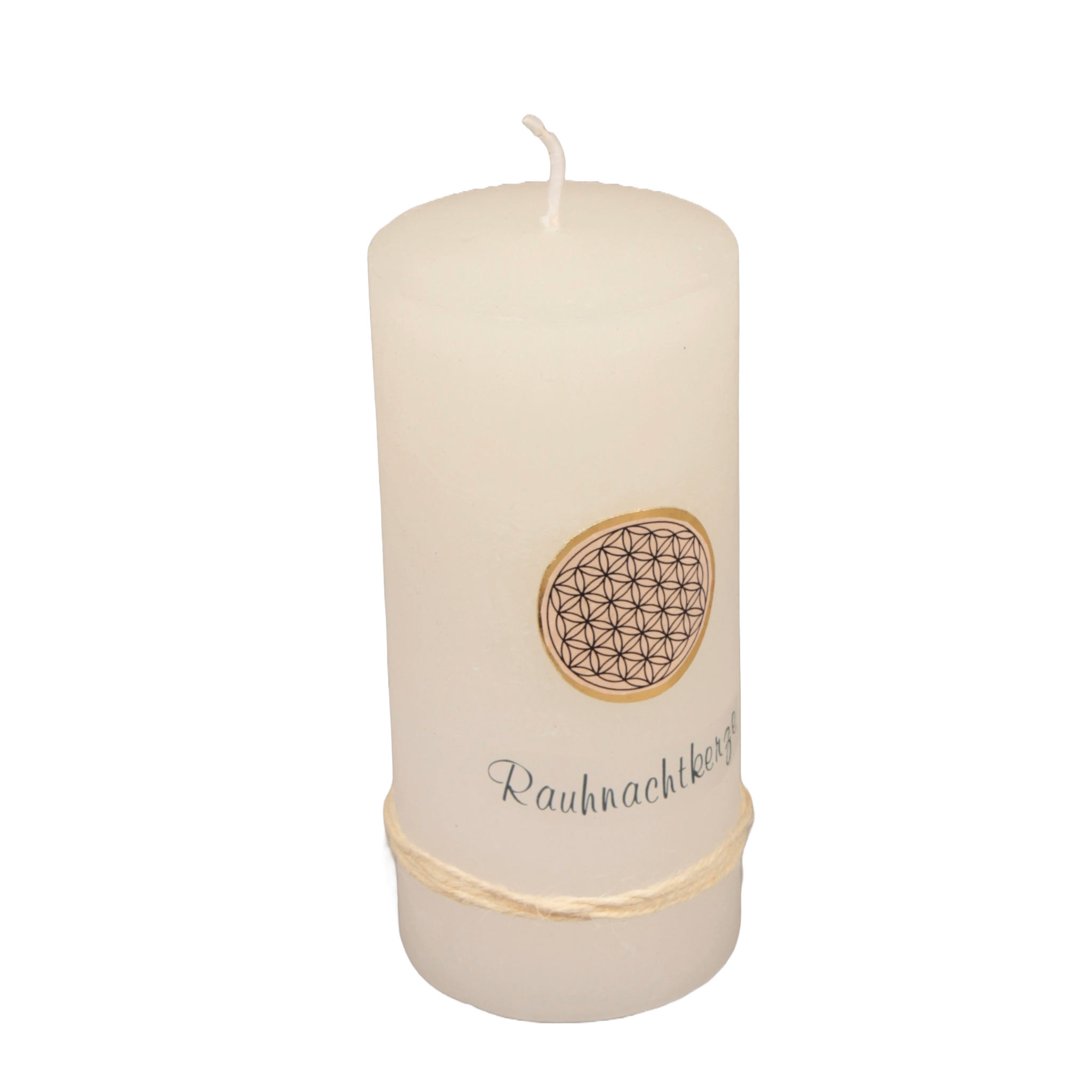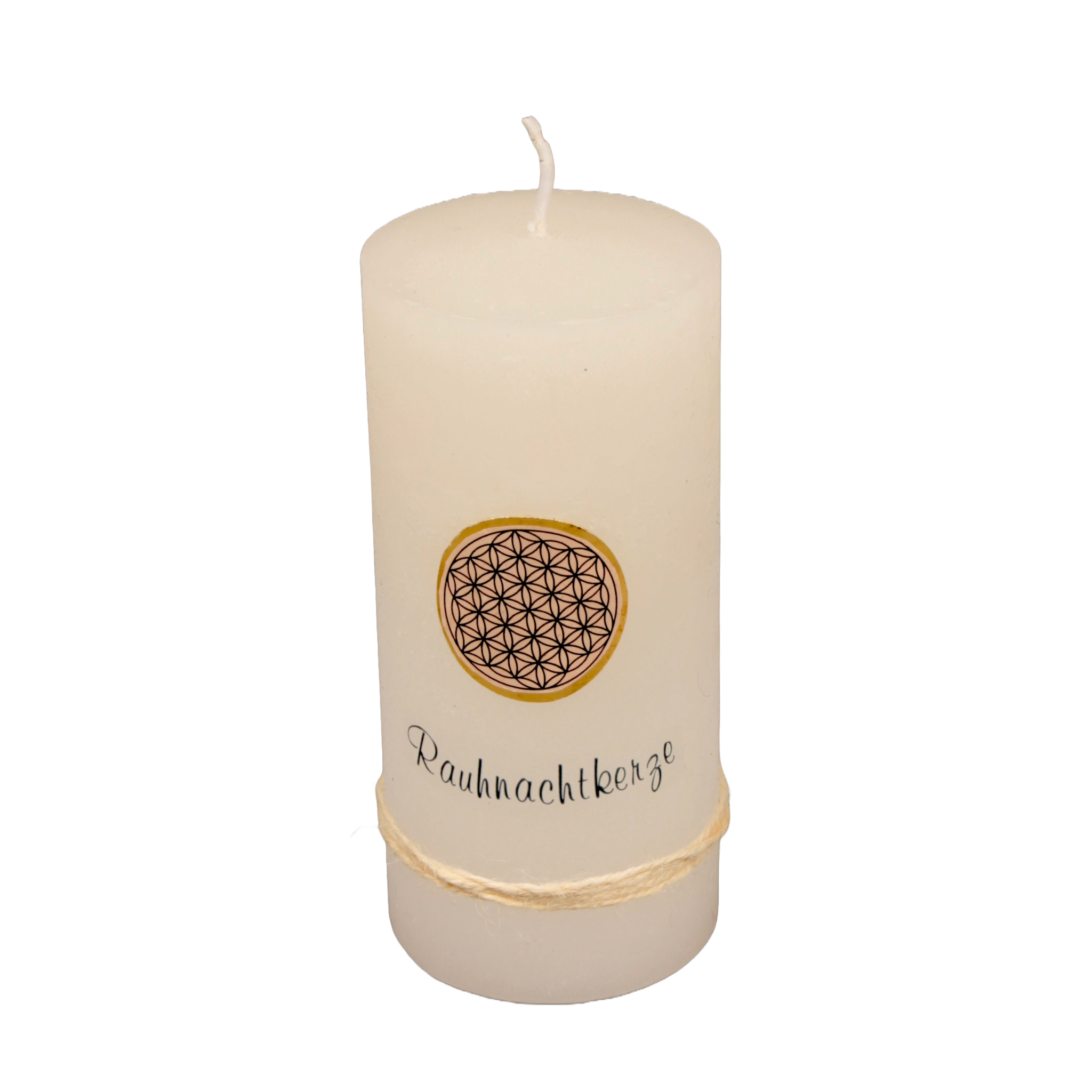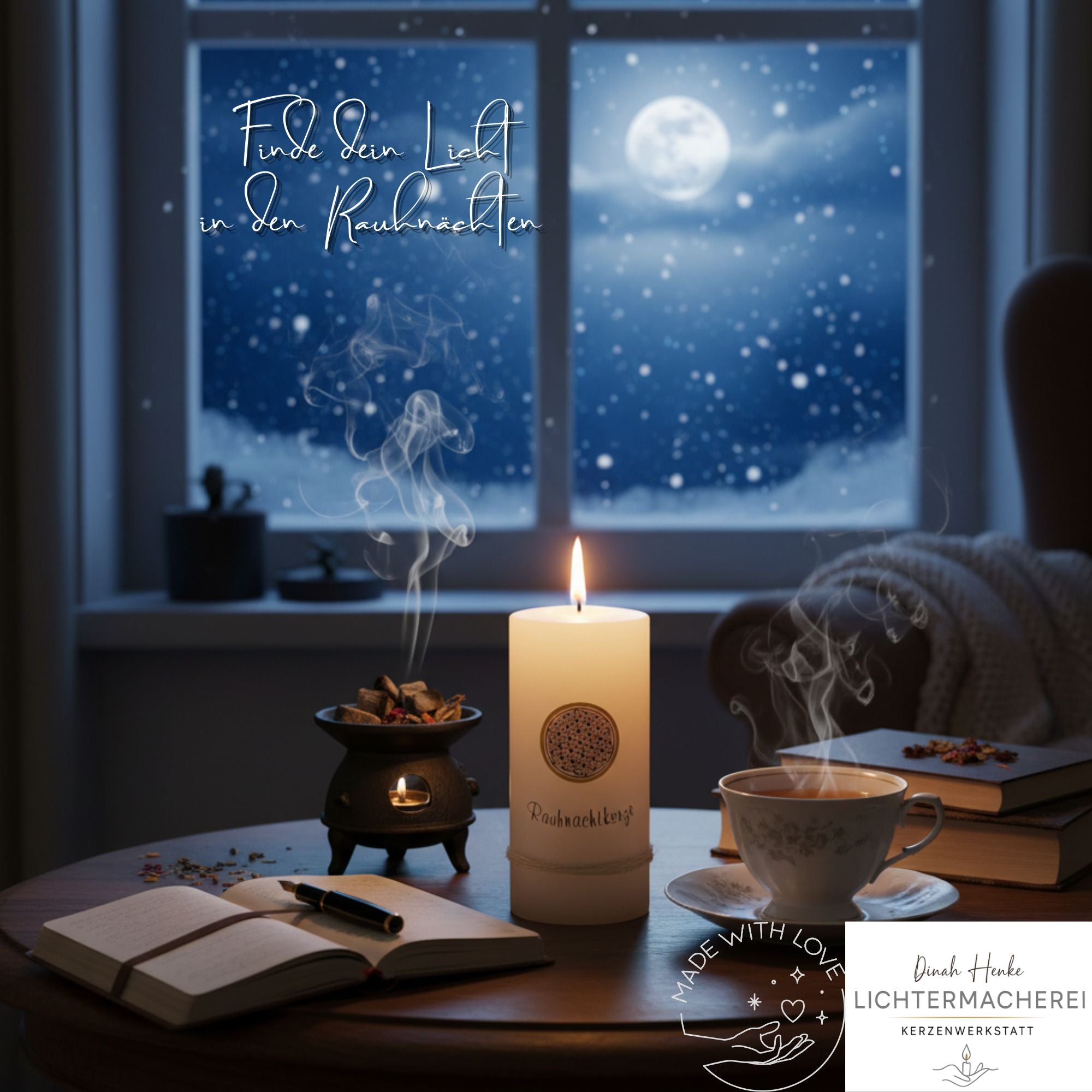 Diese handgefertigte Rauhnachtkerze in edlem Weiß mit rustikaler Oberfläche begleitet dich durch die geheimnisvolle Zeit zwischen den Jahren – eine Phase des Loslassens, der Ruhe und des Neubeginns.
