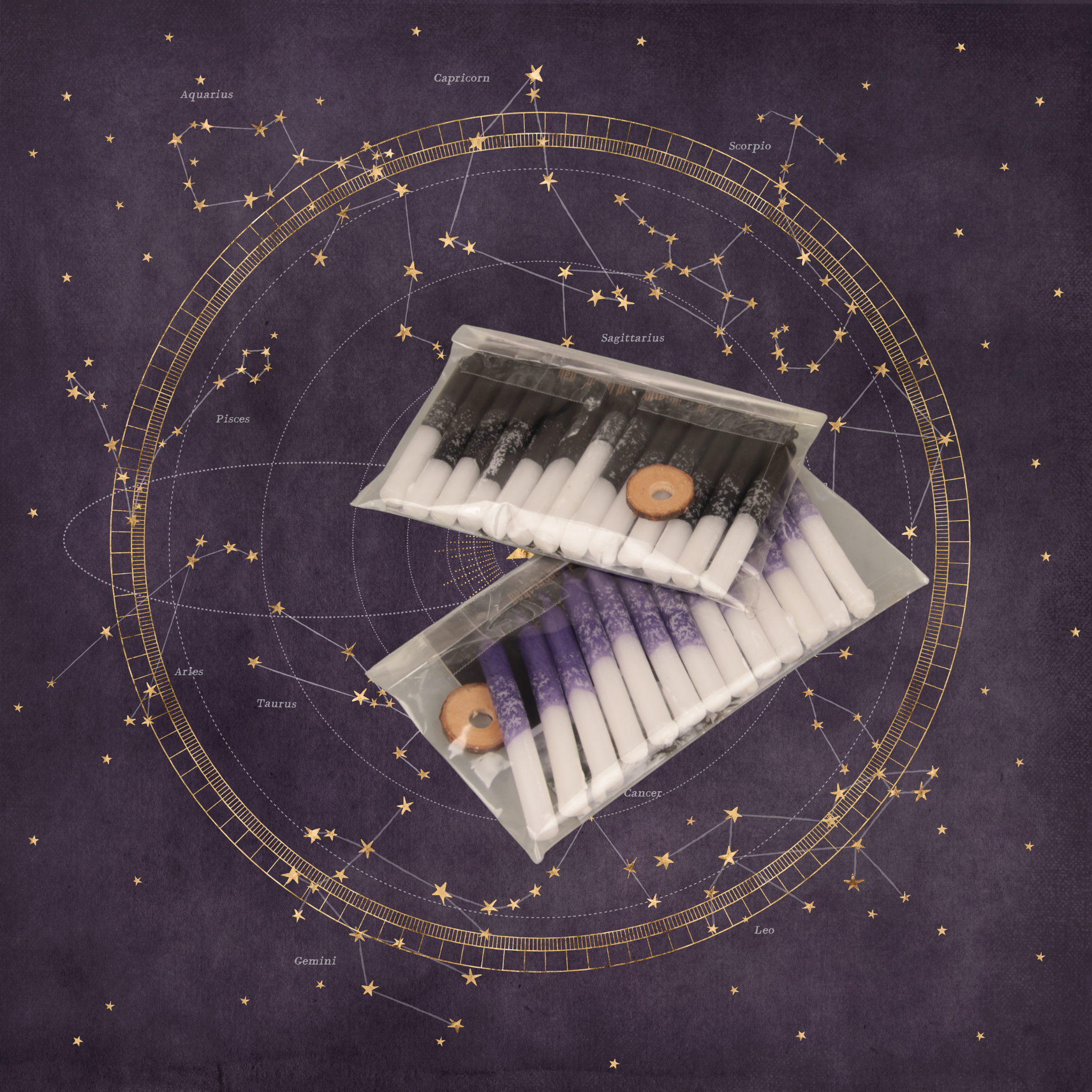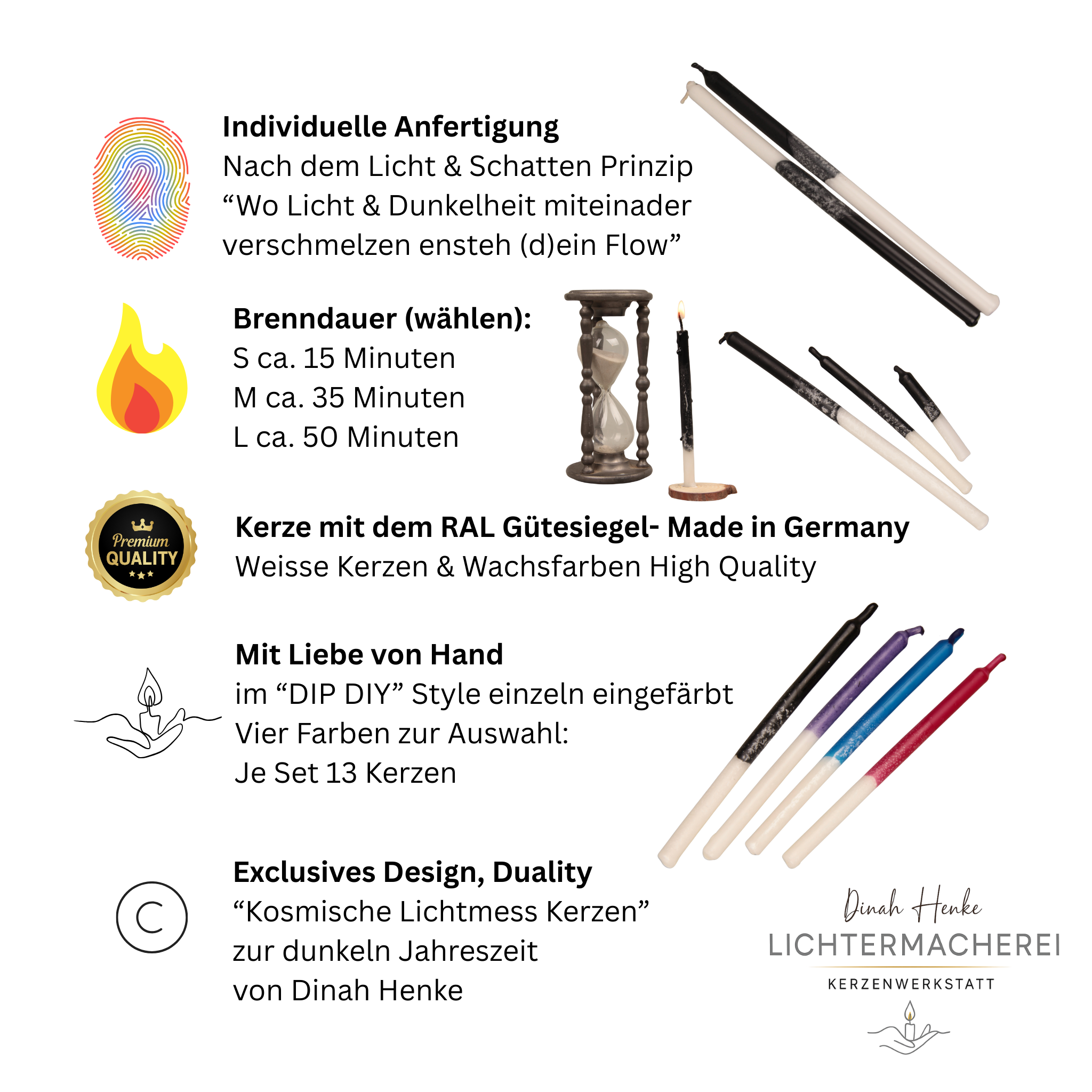 Gefärbt in liebevoller Handarbeit, folgt jede Kerze dem Dualitätsprinzip:
