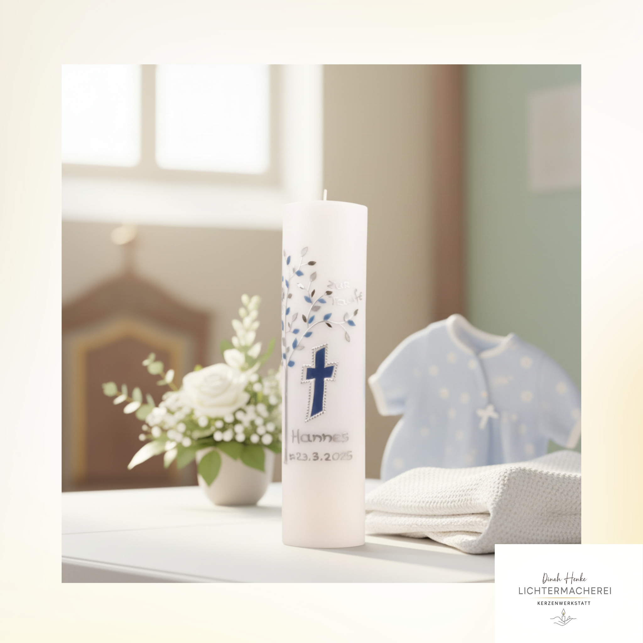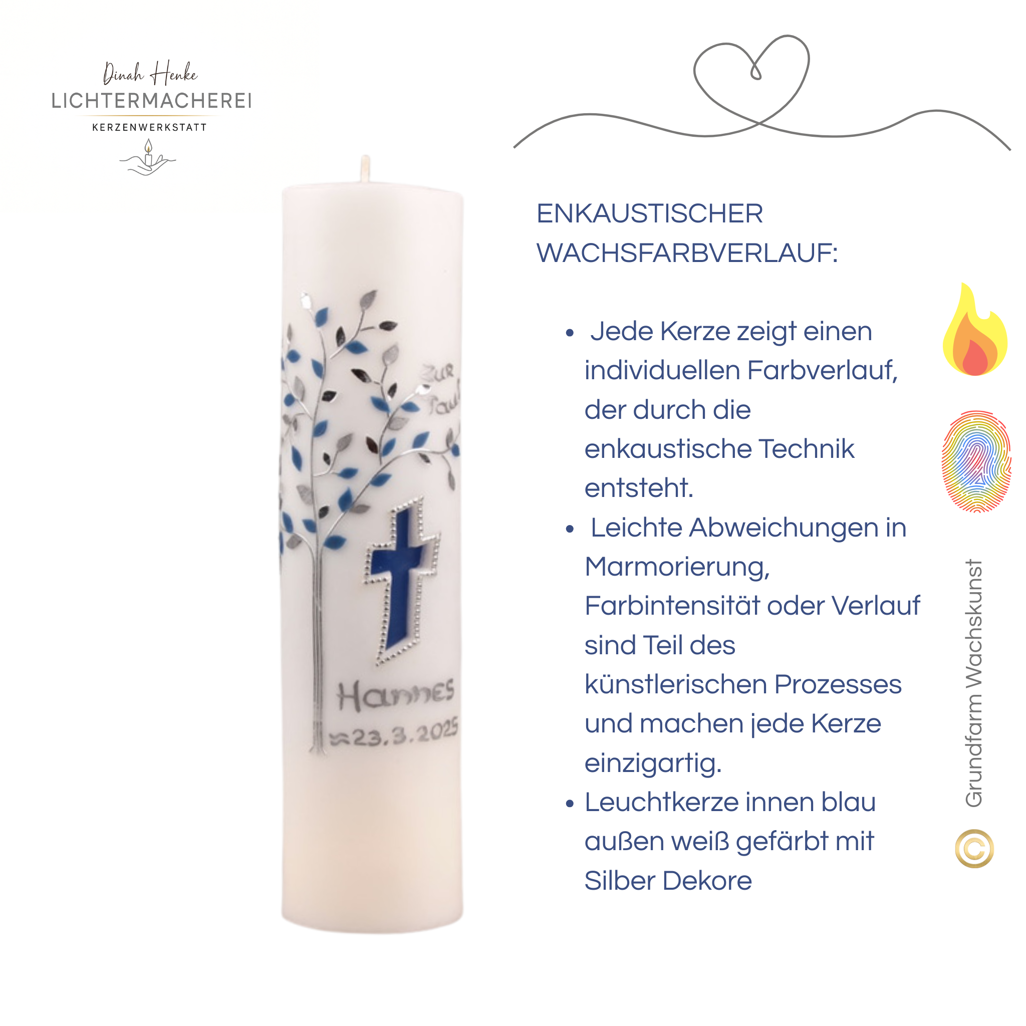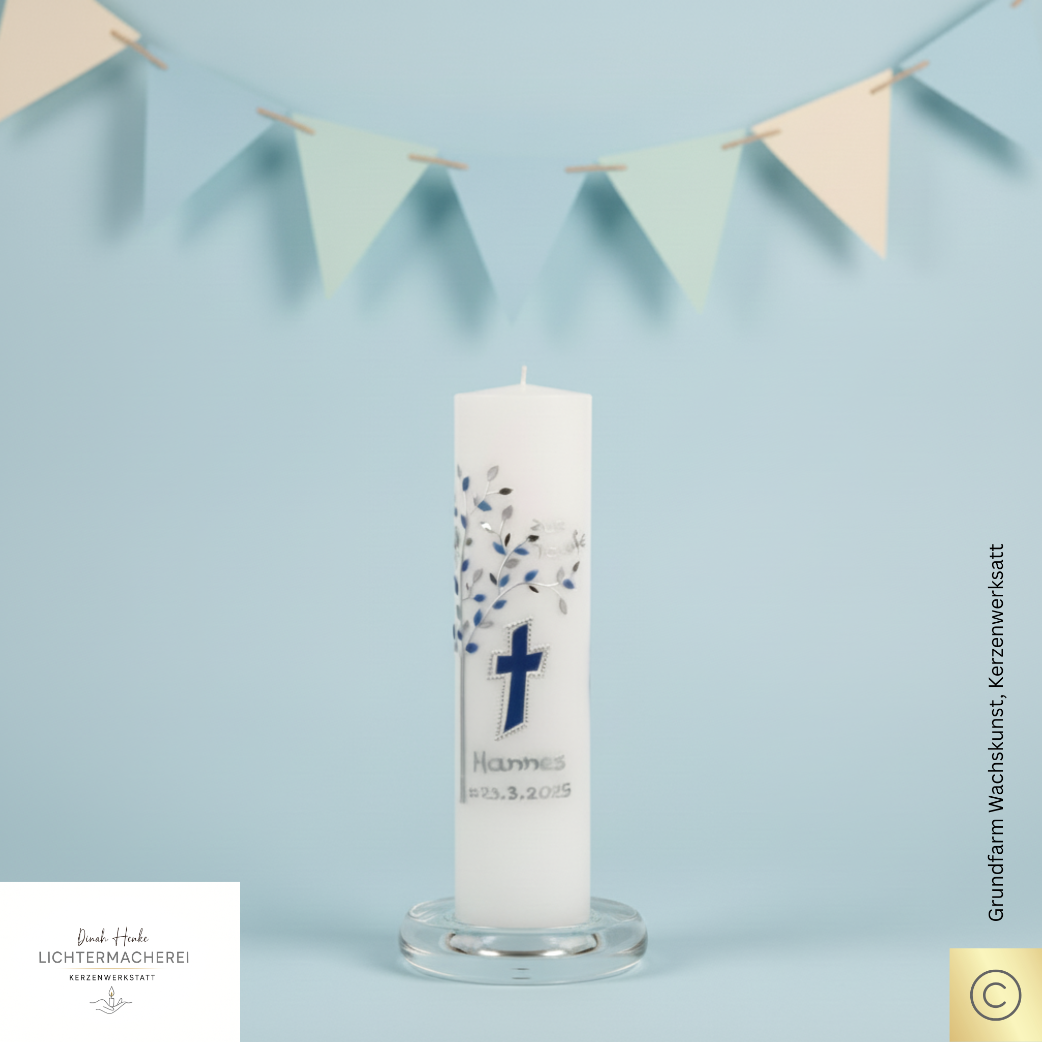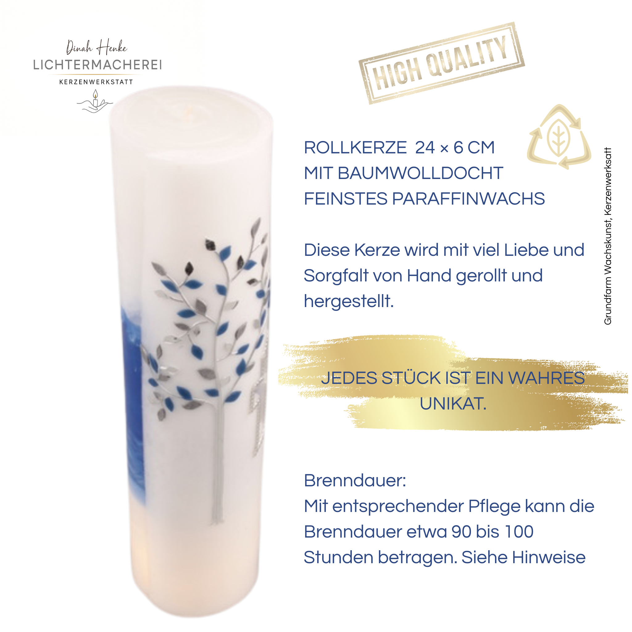 Unsere Taufkerze „Lebensbaum in Blau“ ist kein gewöhnliches Erinnerungsstück – sie ist ein Stück echter Wachskunst. Jedes Detail, jede Nuance entsteht in unserer exklusiven Rolltechnik, die nur in unserer Werkstatt gepflegt wird. Dadurch entsteht der besondere Farbverlauf: ein zartes Blau im Inneren, umhüllt von reinem Weiß – ein Sinnbild für Reinheit, Neubeginn und himmlisches Licht.