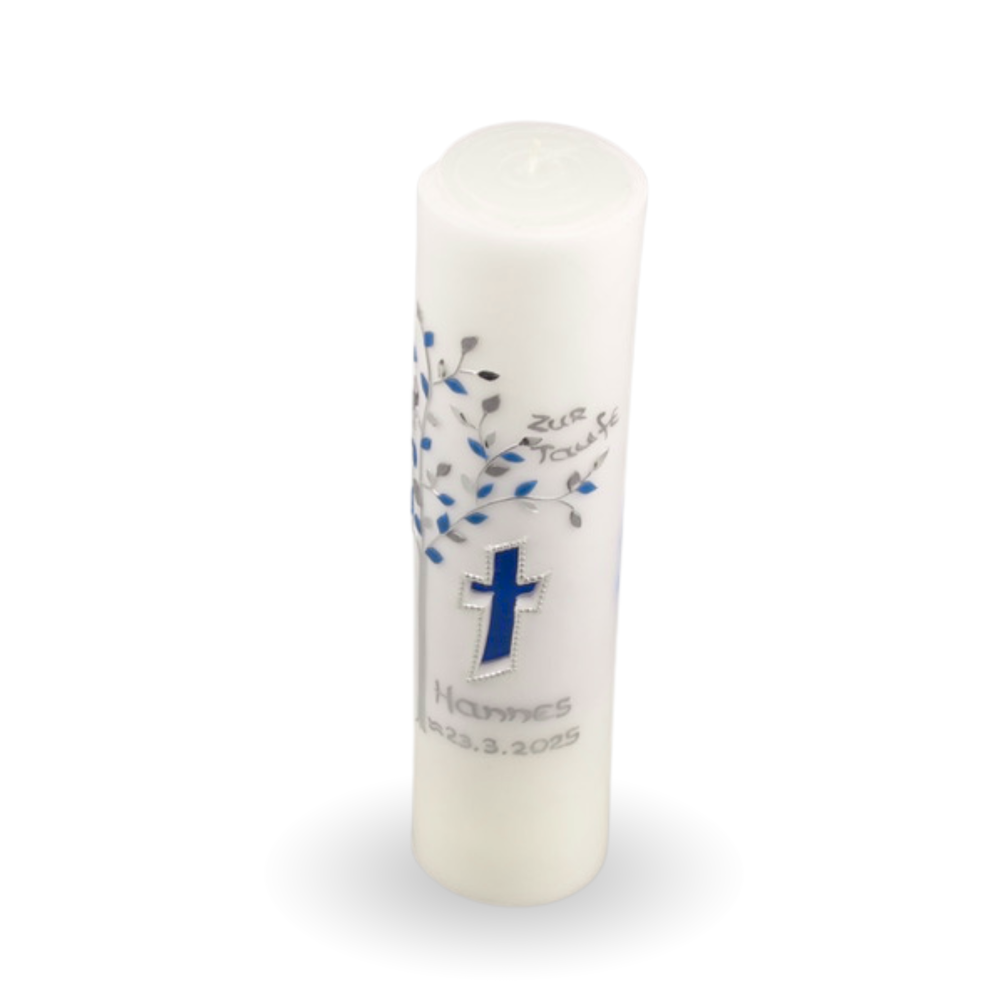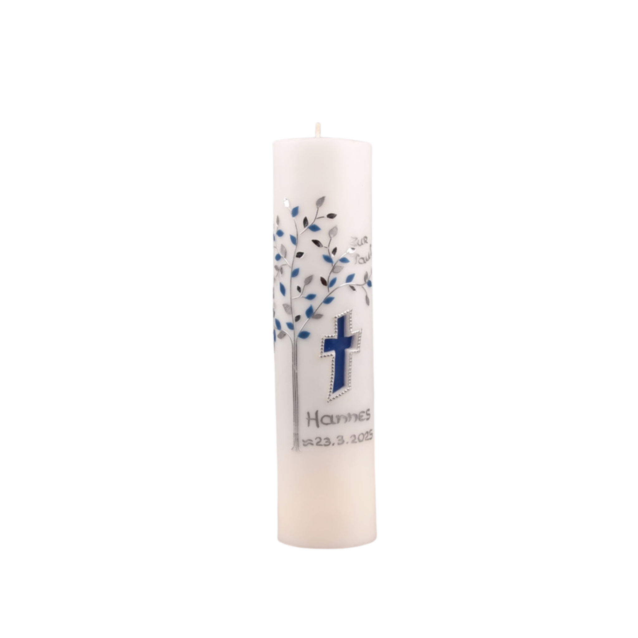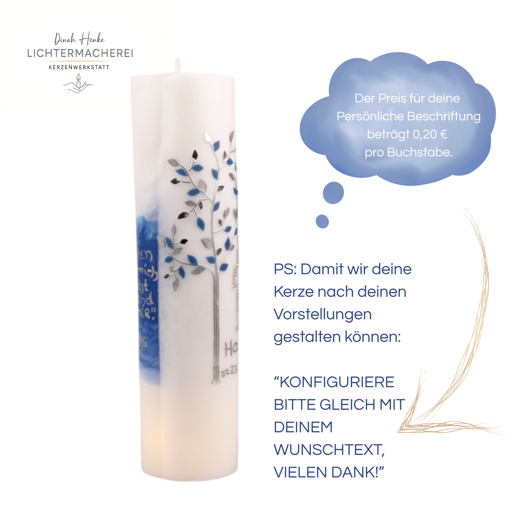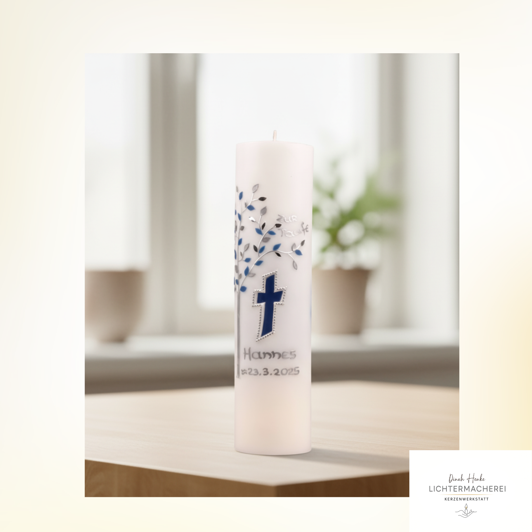Unsere Taufkerze „Lebensbaum in Blau“ ist kein gewöhnliches Erinnerungsstück – sie ist ein Stück echter Wachskunst. Jedes Detail, jede Nuance entsteht in unserer exklusiven Rolltechnik, die nur in unserer Werkstatt gepflegt wird. Dadurch entsteht der besondere Farbverlauf: ein zartes Blau im Inneren, umhüllt von reinem Weiß – ein Sinnbild für Reinheit, Neubeginn und himmlisches Licht.
