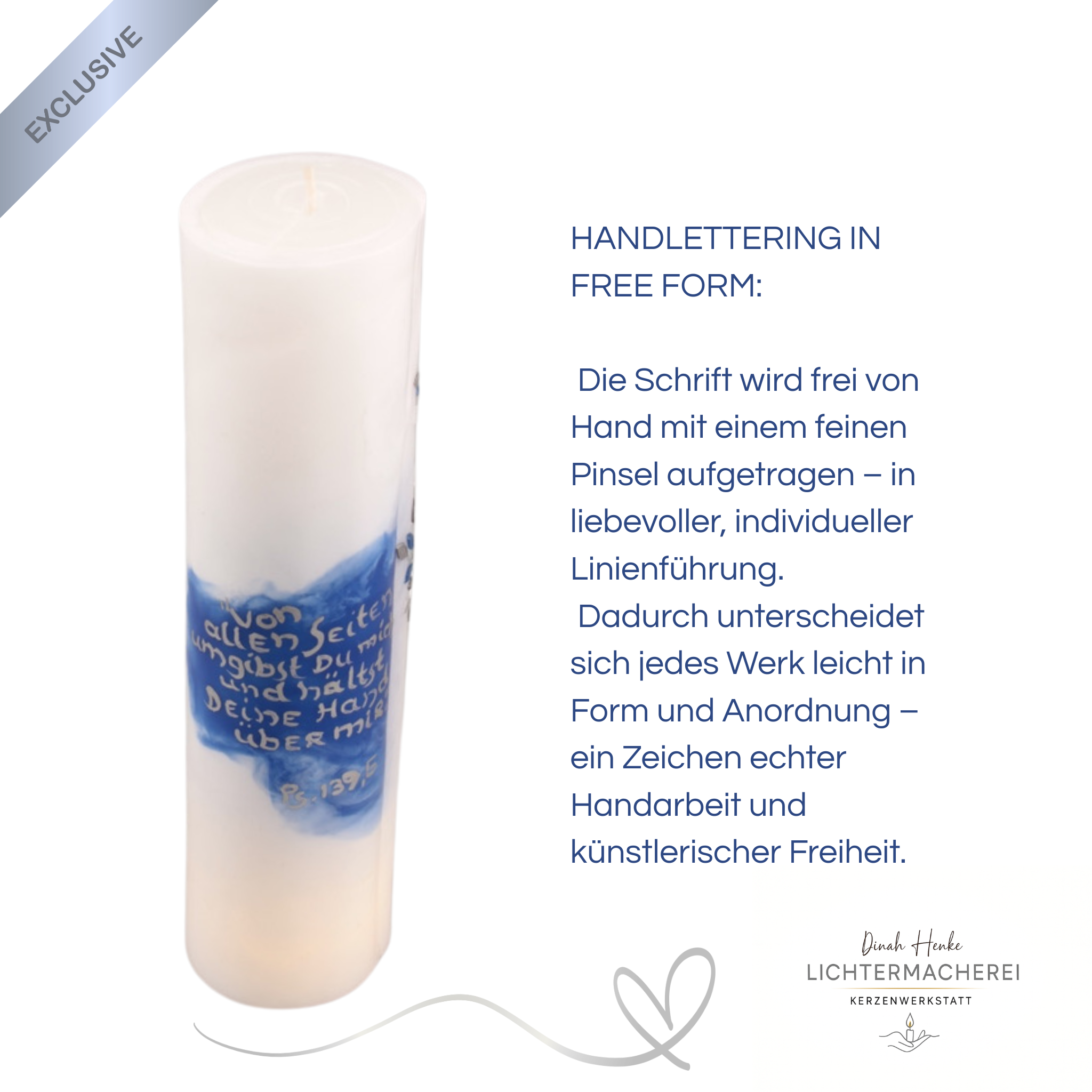 Gestalten Sie Ihre Kerze mit Namen, Taufdatum oder Taufspruch – für ein Andenken, das nur diesem einen Moment gehört.