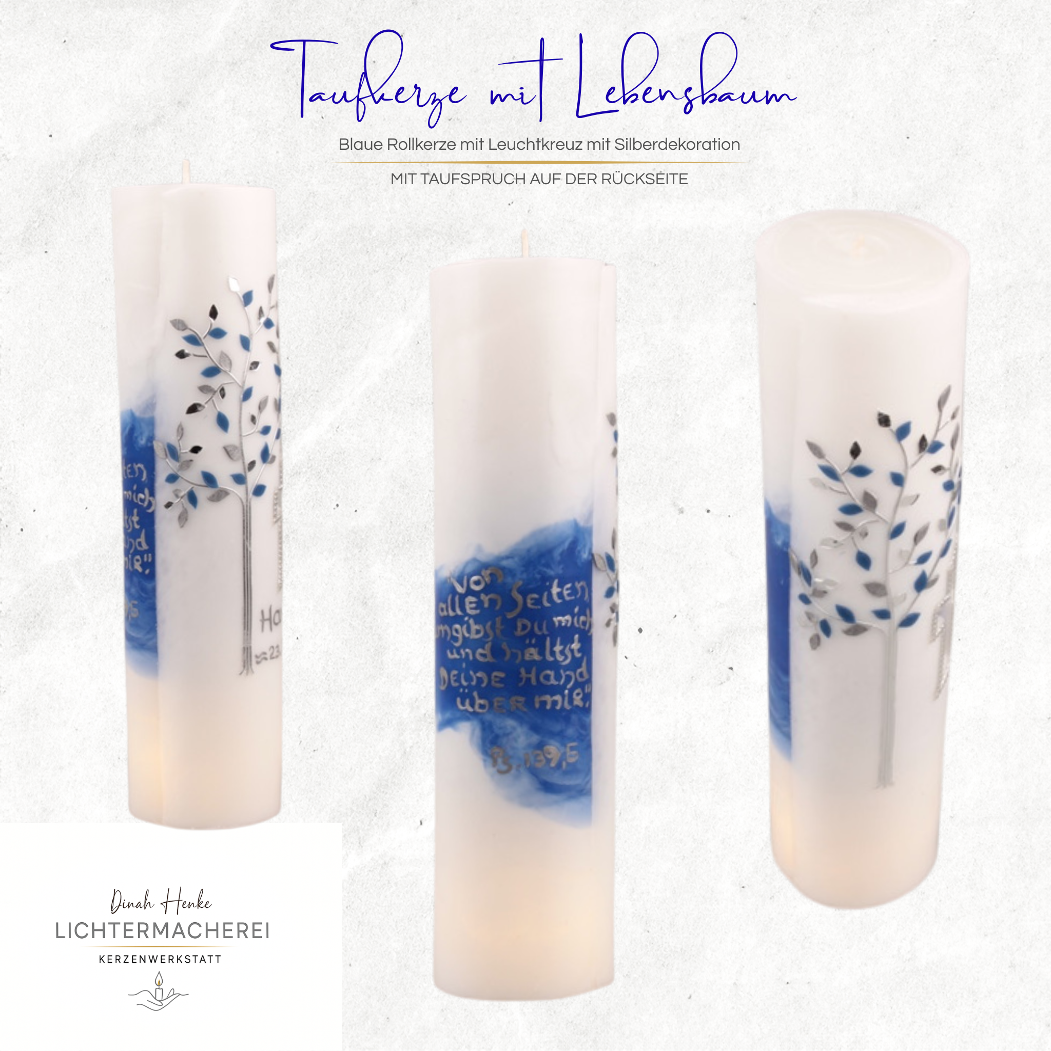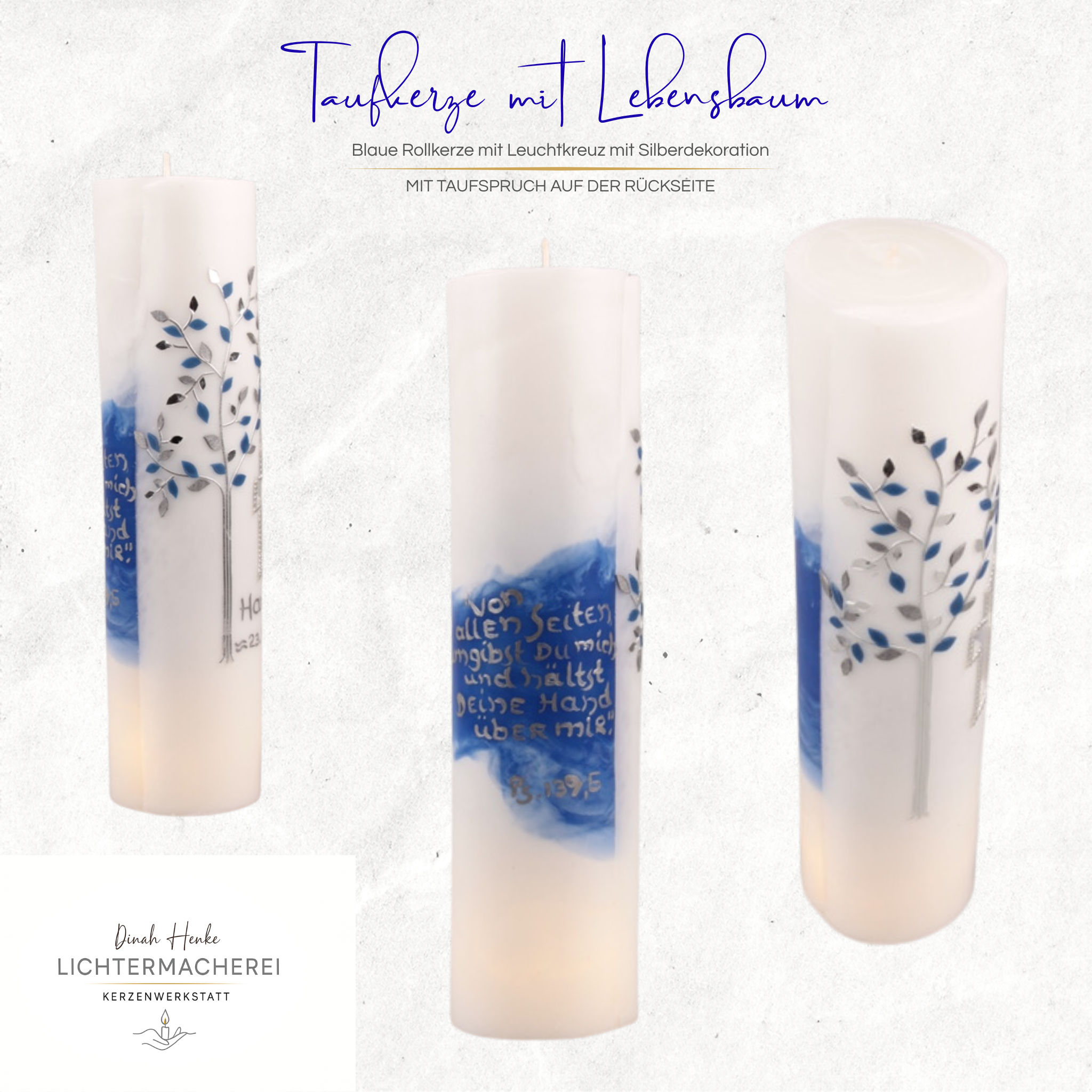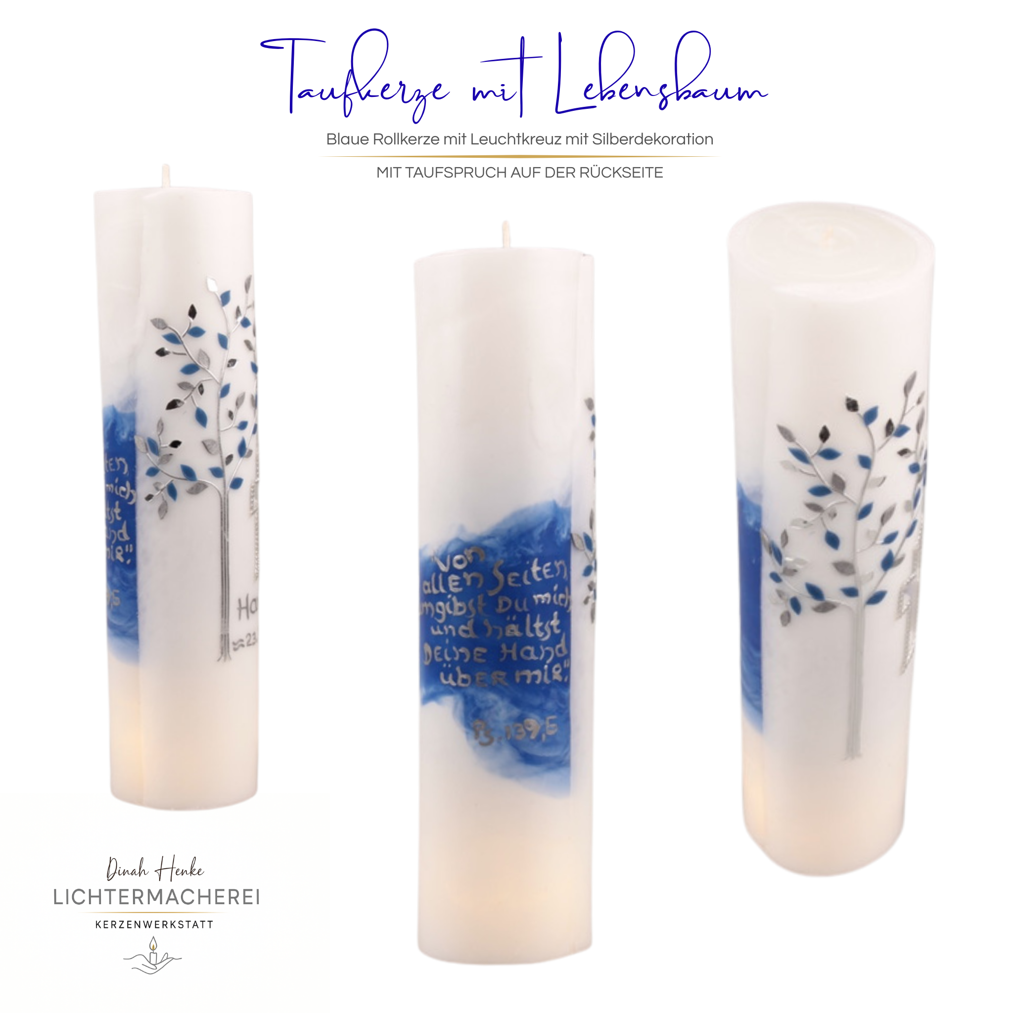 Feiern Sie die Taufe Ihres Kindes mit einer Kerze, die Licht, Symbolkraft und bleibende Erinnerung vereint. Unsere Taufkerze mit Lebensbaum in sanftem Blau ist das perfekte Andenken an diesen besonderen Tag.