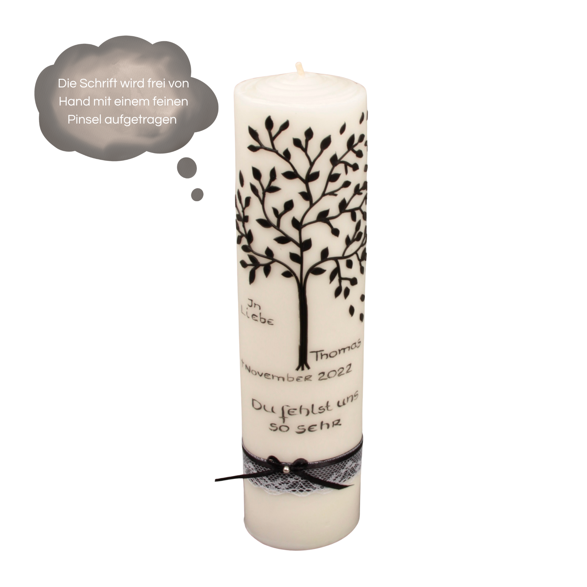 Die Schrift wird in edlem Schwarz von Hand aufgetragen, um den Lebensbaum zu betonen und die Kerze stilvoll zu vollenden.